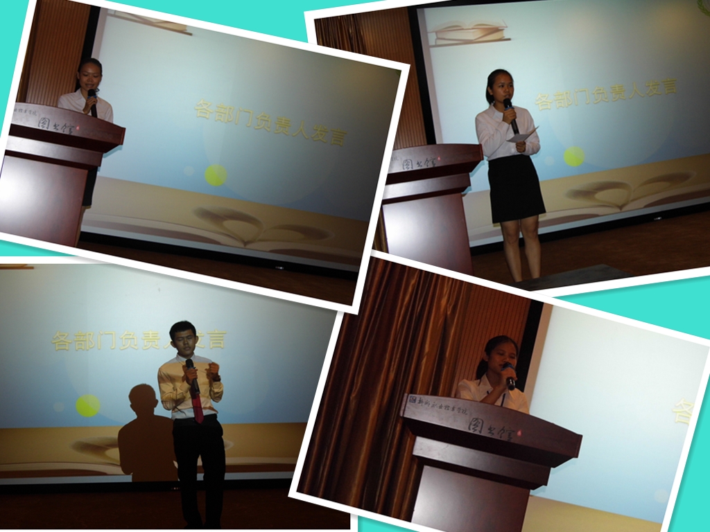 紧接着,琅韵读书会创始人代表黄永鹏、现任会长宋春晓以及各部门理事代表都一一进行了发言。随后全体人员一同观看了社团风采影集;在喜悦高昂的音乐中,各部门理事为新会员授牌。在新会员代表发言环节,新会员们均表示加入琅韵读书会很开心,希望能在读书会里多交朋友,多学到新东西。