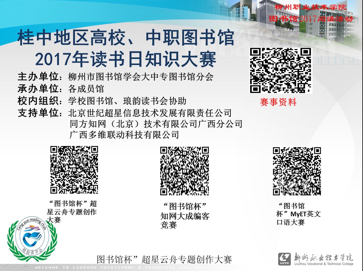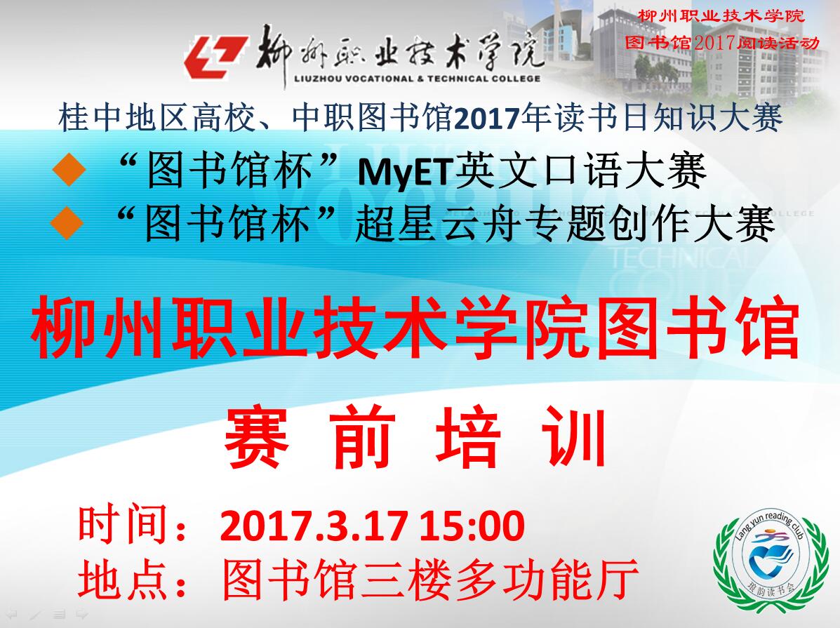 图书馆拟举办2017年“读书日”知识大赛赛前培训 来源: 发布时间:2017-03-15 10:55:00 浏览次数: 次 【字体:小 大】 欢迎全校师生参加。 点击获取: “读书日”知识大赛内容和资料 分享到: 【打印正文】