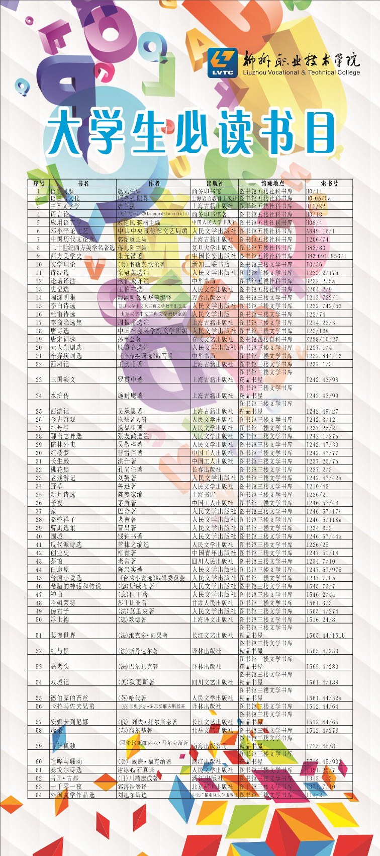 大学生必读书目 来源: 发布时间:2017-04-11 10:49:00 浏览次数: 次 【字体:小 大】 点击文末的文件名可获得电子表格文档 点击下面的文件名可获得电子表格文档 分享到: 【打印正文】