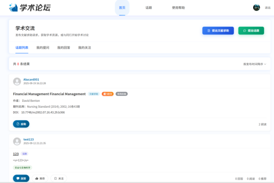 4.学术论坛:学术论坛旨在打造读者和作者之间、作者和作者之间进行学术交流的平台,加强相互之间学术交流,促进合作,推动学术创新和发展,增强作者个人的学术影响力。读者可以向作者提出文献请求互助需求,作者可以向读者传递自己的文献,作者可以上传管理自己发表的,并可以提出一些研究话题和其他作者或读者进行学术讨论交流。