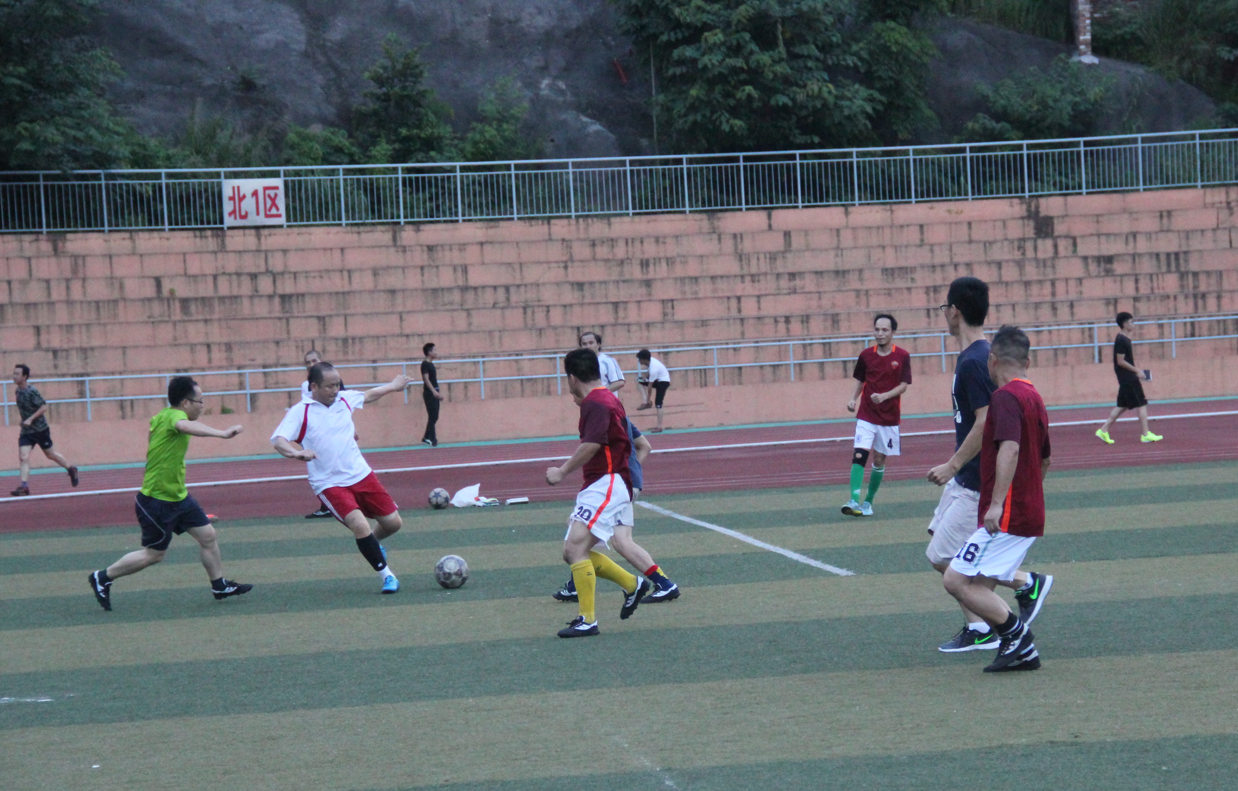 与机电教工队PK的公共基础部教工队,仅以1分劣势暂居积分榜第三位。双方球员中都有不少学院教工队的队员,又都是曾获得过冠军的“豪门”,战况激烈。第一、二节比赛,公共基础部教工队坚持防守反击战术,严防死守,对对方核心球员进行重点盯防,守门员也发挥出色,多次化解了机电教工队的犀利进攻;同时,也打出了几次漂亮的防守反击,多次高质量的远射成功制造了对方球门区内的混乱。前两节比赛双方均无建树,第三节,公共基础部队员后卫注意力开始下降,在一次禁区混战中被对手攻入一球,一时乱了节奏,后卫大举压上,被机电队在终场前攻入一球,最后以0:2告负。