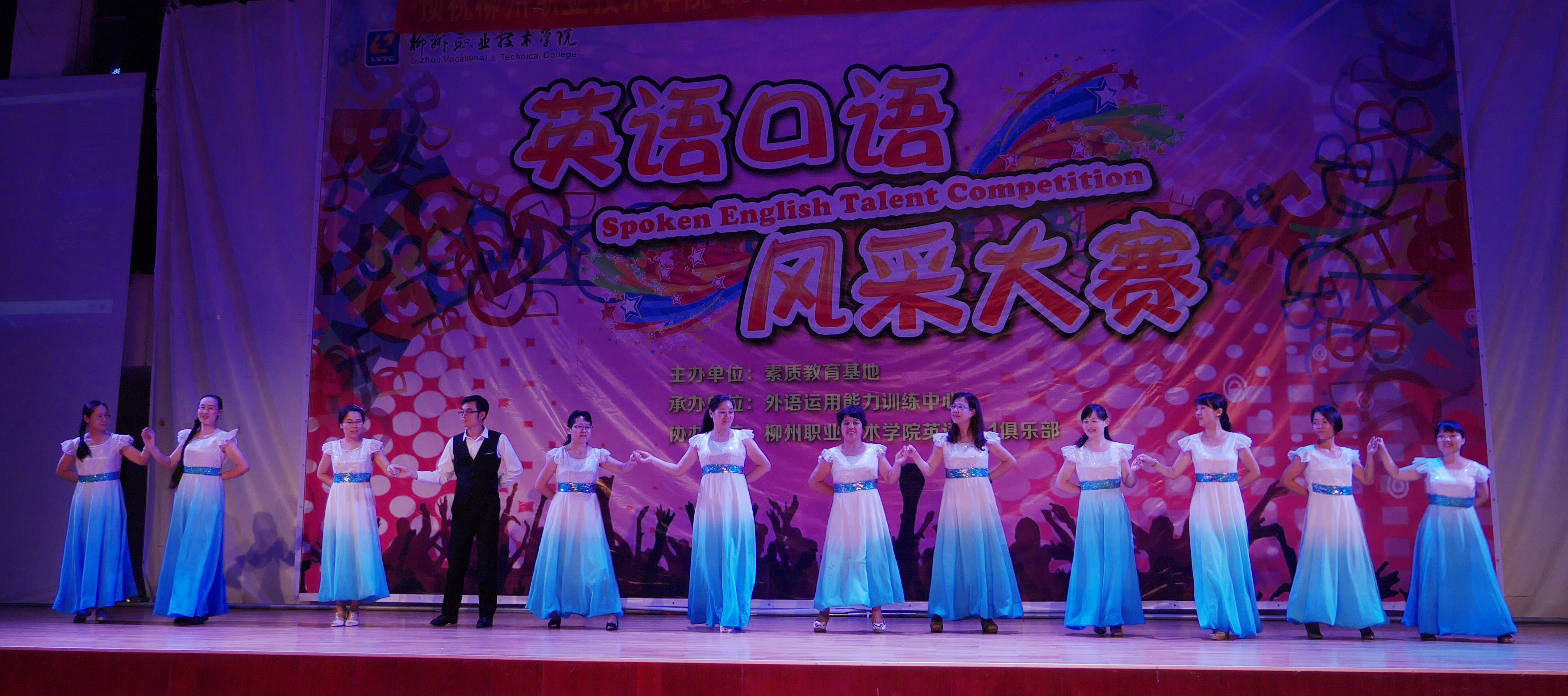 英语口语风采大赛决赛共有英文歌曲、英语小品、英语故事及英语影视配音四个赛项。2014数控技术3班何欢的一首经典歌曲You Raise Me Up拉开了晚会的帷幕,触动心弦的旋律一开场就引起了观众内心的共鸣。随后,由龙智霖同学带来的英语故事《The Rocket ship》似乎把观众们带回到了美好的童年时代,他抑扬顿挫、声情并茂地演绎赢得了经久不息的掌声。由2014级、2013级影视动画班同学带来的英语配音节目《冰雪奇缘》和《精灵旅社》呈献给观众两段令人难忘的旅程,影片强大的视觉冲击力加上惟妙惟肖的配音,引得台下观众时而屏息聆听,时而开怀大笑。2014汽车运用技术班龙飞、莫祖镇等学生演员,通过恰当的肢体动作、丰富的面部表情、流利的语言等富有感染力的表演成功塑造了一个“武松打虎”经典小品剧。整场晚会精彩纷呈、好戏连台。2013模具设计与制造3班梁天与李昌洪同学深情款款的对唱,蒙庆丽、梁美婷、张清伟等同学的倾情演绎、小红帽精彩神奇的小品表演、高职英语系列课程团队教师们的曼妙舞姿……一次次赢得观众们的热烈喝彩,将现场推向高潮。