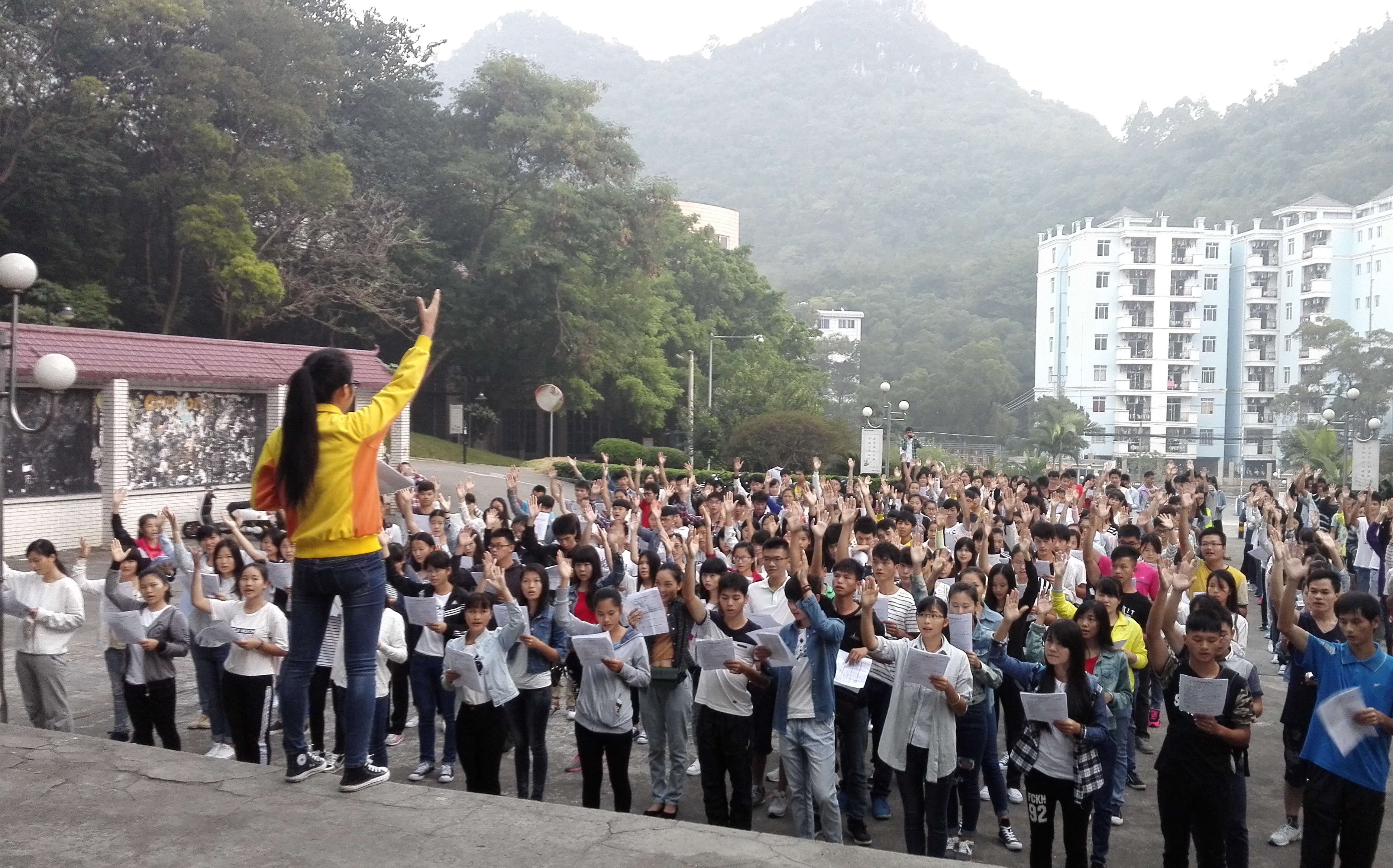 新闻网消息(通讯员/公共基础部 欧阳锦屏 英语1+1俱乐部唐影妮 摄影/韦念)10月19日清晨,校园还被晨雾笼罩,德馨楼前就已是书声琅琅。这是英语1+1俱乐部在新学年招新后的第一次晨读活动,参加此次晨读活动的有俱乐部的两位指导老师、第八届理事以及两百多名新会员。