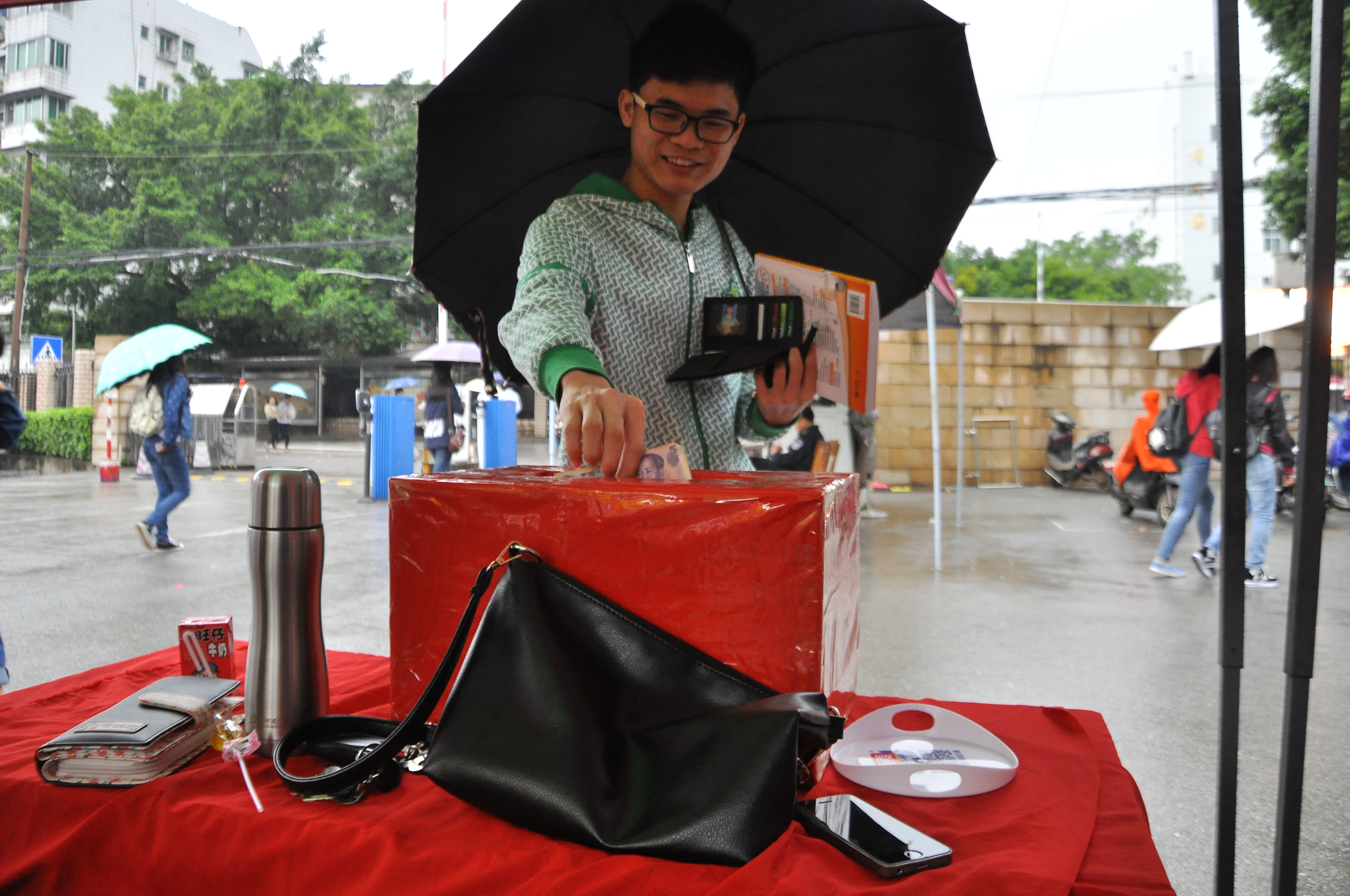 在公共基础部陈芳副主任简短的开幕式致辞之后,本次公益营销大赛拉开了帷幕。每一个团队都拿出自己最漂亮、最有特色的展品上台展示,为的是吸引注意,打响品牌,赚足人气。随着公益营销活动的开始,学院A区变得更加热闹起来。各大摊点中,有的大声呦喝、有的极力推销,每个人都使出浑身解数积极的投入到比赛中。琳琅满目的商品、摊前熙熙攘攘的人流和此起彼伏的吆喝声,为即将到来的“双十一”购物节增添了几分节日色彩。然而,天有不测风云,一场大雨突如其来,但各个团队并没有因为下雨撤摊,而是坚守阵地,在雨棚中继续叫卖。赛场除了进行商品销售之外,还设有爱心捐赠箱,接受爱心人士的捐赠,实行营销与公益相结合,最后在销量的基础捐赠出一部分公益基金给“女童?;ぁ毕钅亢妥手独⊙У难?。最后,“平凡梦”团队较好地把公益理念与销售策略相结合,最终获得“校园公益营销形象大使”荣誉称号,他们将于近期与领导、老师一同前往三江县独峒乡知了村中心小学、归滚小学、金秀共和希望小学进行现场捐赠活动以及“女童?;ぁ毕钅炕疃?br> 11月11日19:30在博闻楼106举行的闭幕式上,学院团委书记王慧对这三天取得的销售成绩、同学们的努力以及坚持不懈的精神给予了高度评价;大学生KAB创业俱乐部指导老师许明教授进行了会议总结,对同学们的表现进行了点评,为同学们以后的创业道路指明了方向。