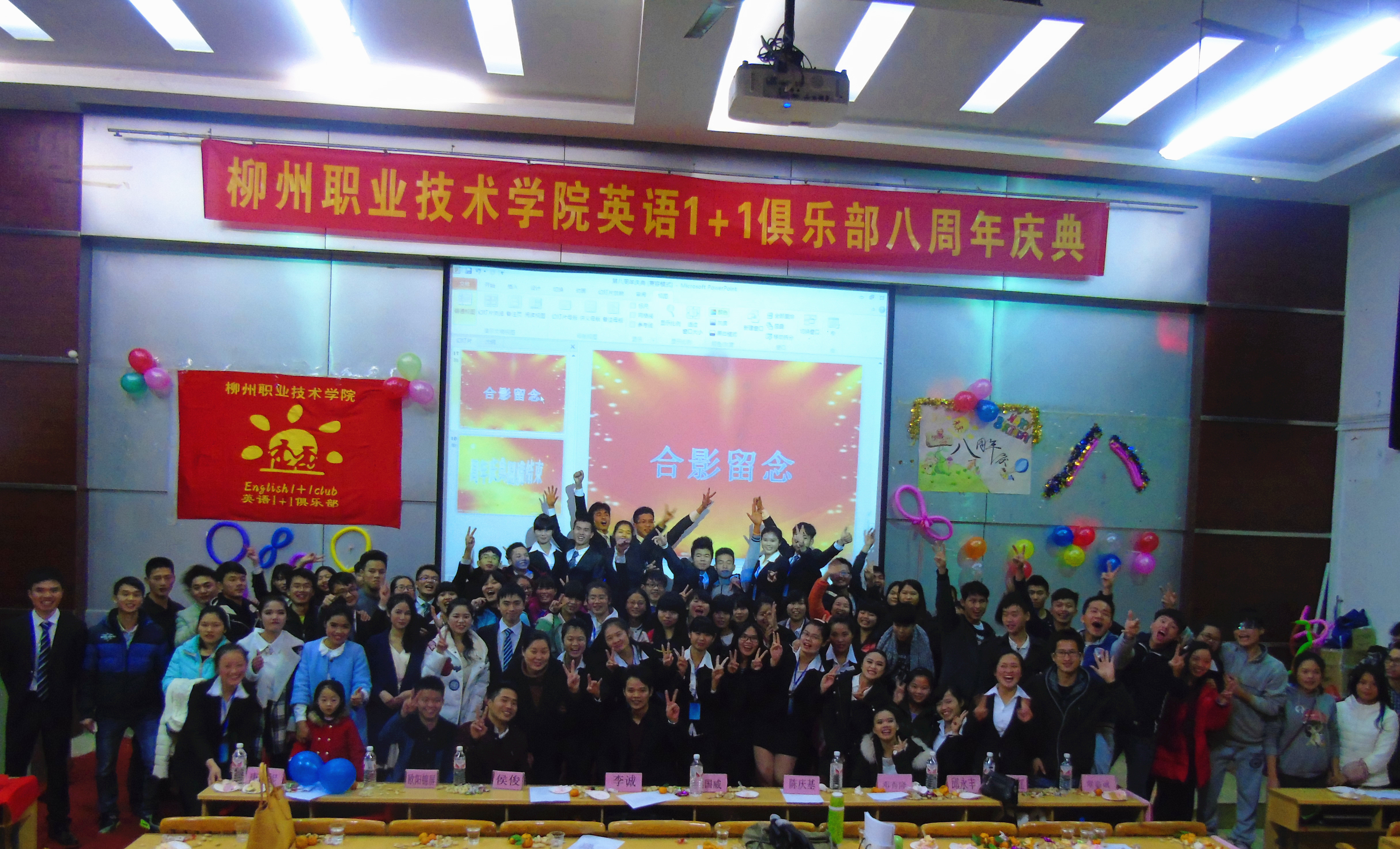 新闻网消息(通讯员/公共基础部 欧阳锦屏 英语1+1俱乐部 唐影妮 摄影/莫启福)12月26日晚,博闻楼110教室歌声飞扬、笑声不断,英语1+1俱乐部“宣扬英语、精彩庆生、传递激情、共享快乐”社团八周年庆典晚会在此激情举办。欧阳锦屏老师、侯俊老师、首届会长李诚、第六届会长姚国威以及俱乐部的所有成员参加了本次晚会。