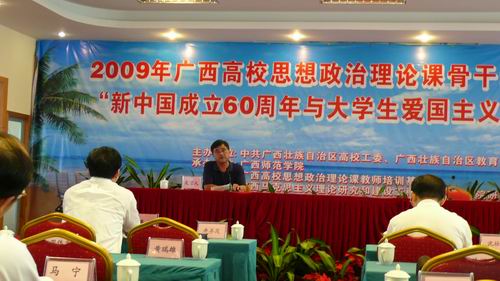 2009年8月23—29日,广西高校思想政治理论课骨干培训班在南宁举行,广西高校工委、教育厅、63所高等院校以及教育部有关部门、区外高校等单位共131人参加了会议。区高校工委领导做了重要讲话,来自武汉大学的沈壮海教授、首都师范大学的王淑芹教授、中山大学的郑永廷教授分别作了《文化软实力的中国话语、中国境遇与中国道路》、《大学生诚信道德概观及其建设思考》、《马克思主义理论学科前沿问题研究——兼谈高校思想政治理论教育创新》等重要的学术报告。