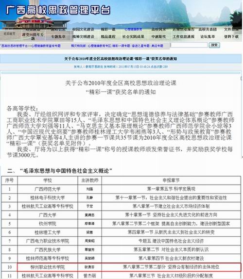 经过历时近5个月的网络评审和专家评审,2010年度全区高校思想政治理论课“精彩一课”的评审结果于2011年7月17日揭晓,共有“思想道德修养与法律基础”、“毛泽东思想和中国特色社会主义理论体系概论”等5门课程35节课入选。我院思政部欧勇芬老师主讲的“毛泽东思想和中国特色社会主义理论体系概论”参赛一节课获奖。