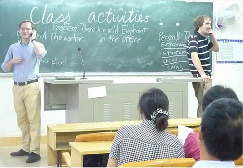 唐丽江老师展示的“掷色子”游戏,把学生的口语练习寓于游戏之中,可让学生轻松愉快地提高英语会话能力。韦鸿发老师的“跑读”游戏,把单一的学生读文字、老师讲解的“静”的传统阅读方式改为一种可以让学生动起来的阅读方式,活跃了课堂气氛,激发了学生的学习热情。罗柳萍老师设计的课堂活动是让学生以答问题编故事方式训练学生的写作能力。侯俊老师的课堂活动是通过按词造句编故事来进训练学生的阅读能力。刘善聪老师介绍了问题答案猜猜配的课堂游戏,周红老师介绍了猜词拼句的游戏,Charles 介绍了排词组句的课堂活动,Spencer展示了根据情景和相关单词编练对话的口语教学活动,武皓老师介绍了串词口语练习活动。研讨会上交流的各种课堂活动涉及到了英语教学中听、说、读、写这四个主要应用能力的训练活动。教师们在今后的教学中若能结合实际教学内容组织开展类似的课堂活动,将在很大程度上有效活跃课堂气氛,寓教于乐,激发学生学习热情,促进和提高课堂学习效率和效果。