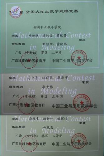 会上公布了2011年全国大学生数学建模竞赛广西赛区获奖情况,我院学生27人获奖。其中,叶进财、梁炜浚、莫远芳三位同学获广西赛区(专科组)二等奖;李柱生、汤新叶、潘辉煌、范业涛、林群昂、覃康宁等六位同学获三等奖;还有张灵、韦义健等十八位同学获成功参赛奖。