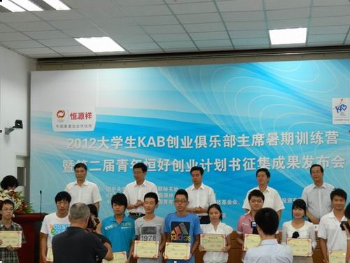 2012年8月18日至22日,由共青团中央学校部、全国学联秘书处主办,KAB全国推广办公室承办的2012年大学生KAB创业俱乐部主席暑期训练营在北京举行,来自全国80多所高校的大学生KAB创业俱乐部主席代表参加了活动。本期训练营以“创意改变生活”为主题,旨在提高KAB创业俱乐部主席的社团领导力,并提升他们创业实践能力。我院第六届大学生KAB创业俱乐部会长卢川同学应邀参加?;嵘?,我院大学生KAB创业俱乐部被评为2011年度全国十佳优秀大学生KAB创业俱乐部。