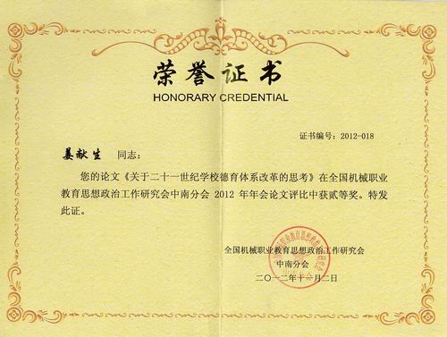 2012年11月2日上午,在全国机械职业教育思想政治工作研究会中南分会2012年年会论文的评选中,我部姜献生主任的论文《关于二十一世纪学校德育体系改革的思考》荣获二等奖。