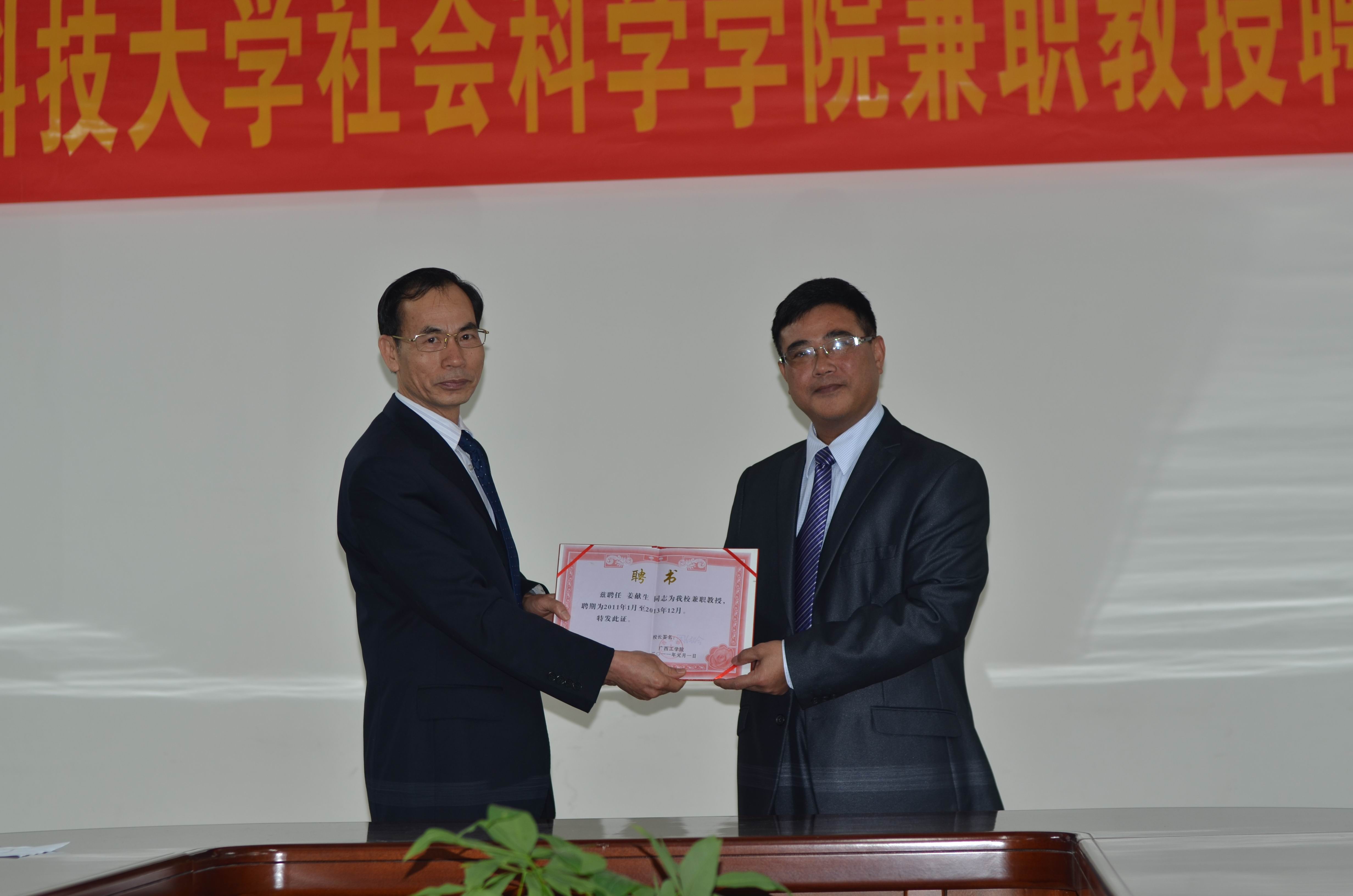 广西科技大学社会科学学院韦廷柒院长给姜献生教授颁发聘书