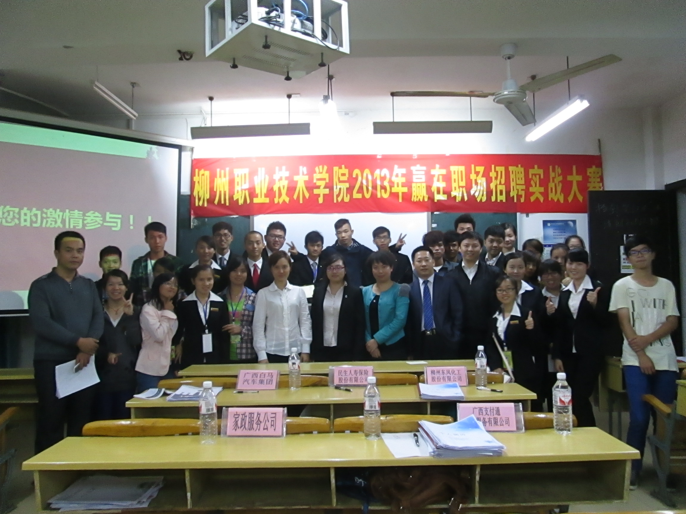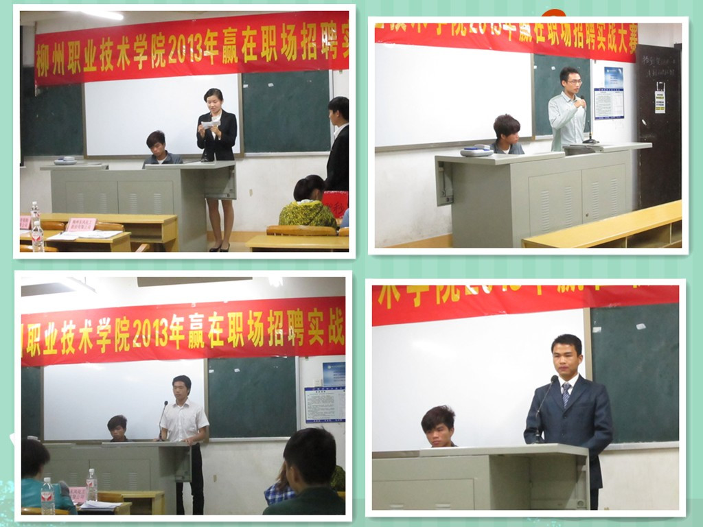 11月10日晚,由我院素质教育基地就业与创业教学团队指导、大学生KAB创业俱乐部承办的首届2013“‘赢在职场’招聘实战大赛”初赛分别于博闻楼106、108教室两个赛场举行。来自广西白马汽车集团、柳州东风化工有限责任公司、柳州市凯滢商贸有限公司、民生人寿保险股份有限公司柳州中心支公司等企业的9名知名企业达人担任此次大赛的评委,学院各系部近百名大三毕业班学生参加了此次初赛。
