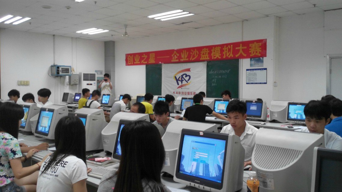“创业之星——企业沙盘模拟实验室”是一套完整的创业模拟训练平台。采用3D虚拟技术,模仿现代企业创业运营的各个场景及操作,与真实的企业运作几乎一样。平台采用贴近真实企业创业环境的竞争模式,模拟很多真实企业管理运作方面的场景。如模拟的实验室中,有企业的总部、财务部、制造部、研发部、市场部、销售部以及人力资源部,每个部门都有相应的职责。此次的参赛选手由沙盘培训的40名同学组成,分为20个小组,每组两人。各小组的同学相互合作,完成了产品设计、研发、销售、设备购买、人员招聘、生产管理、财务管理等工作,模拟公司运营的整个过程,比赛是对参赛者智力和耐力的一次严峻考验。