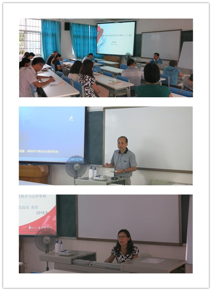 会上,黄海峰、冯新宇、郭星等3名参加教育部及自治区教育厅2015年高校思想政治理论课新修订教材培训会的老师分别介绍了2015年《毛泽东思想与中国特色社会主义理论体系概论》、《思想道德修养与法律基础》、《形势与政策》三门课程内容的修订情况,就每个章节的修订内容的变化、教学重点与难点、新增内容的背景及意义等问题进行了概括分析和阐述。