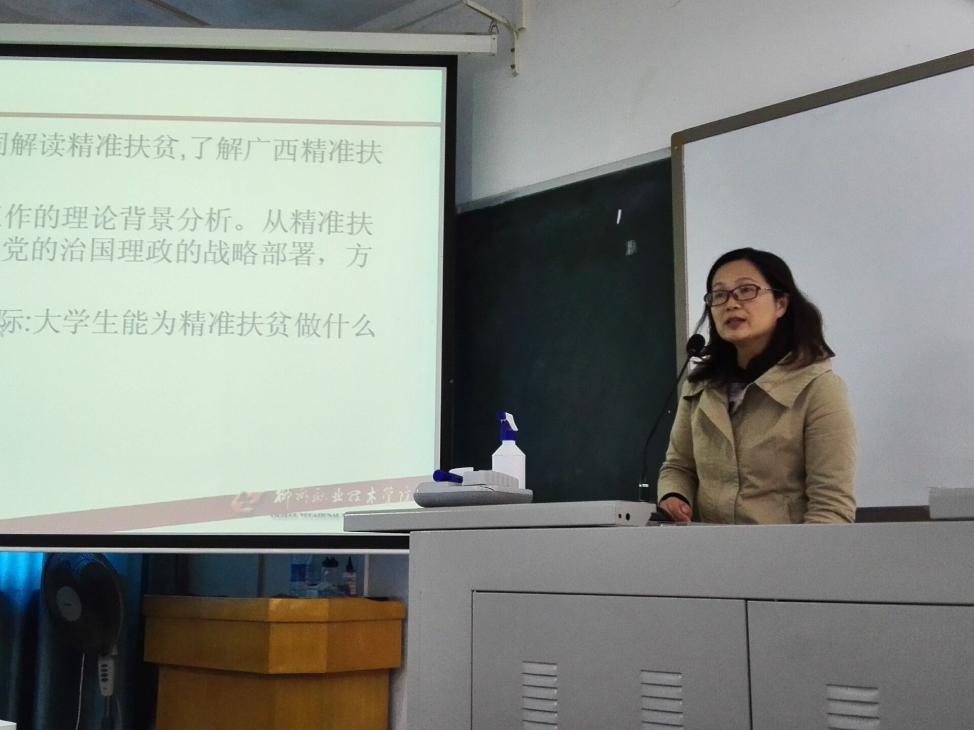本期《形势与政策课》主题为“我国精准扶贫攻坚战面临的形势和任务”。培训中,周副教授结合中央、自治区政府文件,通过精准扶贫工作的理论以及背景分析,以翔实的数据,从“脱贫、精准、时间表、逐户销号、军令状、投入”六大关键词对精准扶贫内涵、目标和任务及历史意义进行了解读,分析了广西精准扶贫的形势与特点,介绍了我区在增加收入、改善环境、移民搬迁等方面精准扶贫所采取的措施。为让学生深入学习了解党中央治国理政战略思想,坚定实现中国梦的信心决心,她建议当代大学生要为转变等靠要等一些落后的思想观念做一些事,为帮扶脱贫找一些务工致富信息,用自己的专业知识为贫困人群服务,努力成为勤劳致富的能手,成为建设小康美好生活的示范。