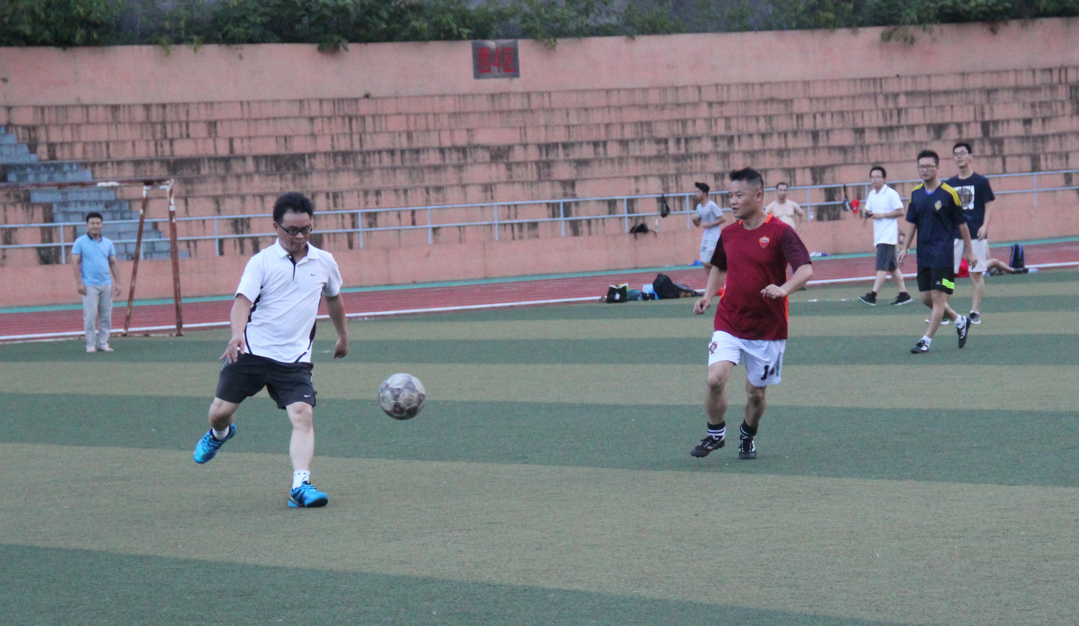 与机电教工队PK的公共基础部教工队,仅以1分劣势暂居积分榜第三位。双方球员中都有不少学院教工队的队员,又都是曾获得过冠军的“豪门”,战况激烈。第一、二节比赛,公共基础部教工队坚持防守反击战术,严防死守,对对方核心球员进行重点盯防,守门员也发挥出色,多次化解了机电教工队的犀利进攻;同时,也打出了几次漂亮的防守反击,多次高质量的远射成功制造了对方球门区内的混乱。前两节比赛双方均无建树,第三节,公共基础部队员后卫注意力开始下降,在一次禁区混战中被对手攻入一球,一时乱了节奏,后卫大举压上,被机电队在终场前攻入一球,最后以0:2告负。