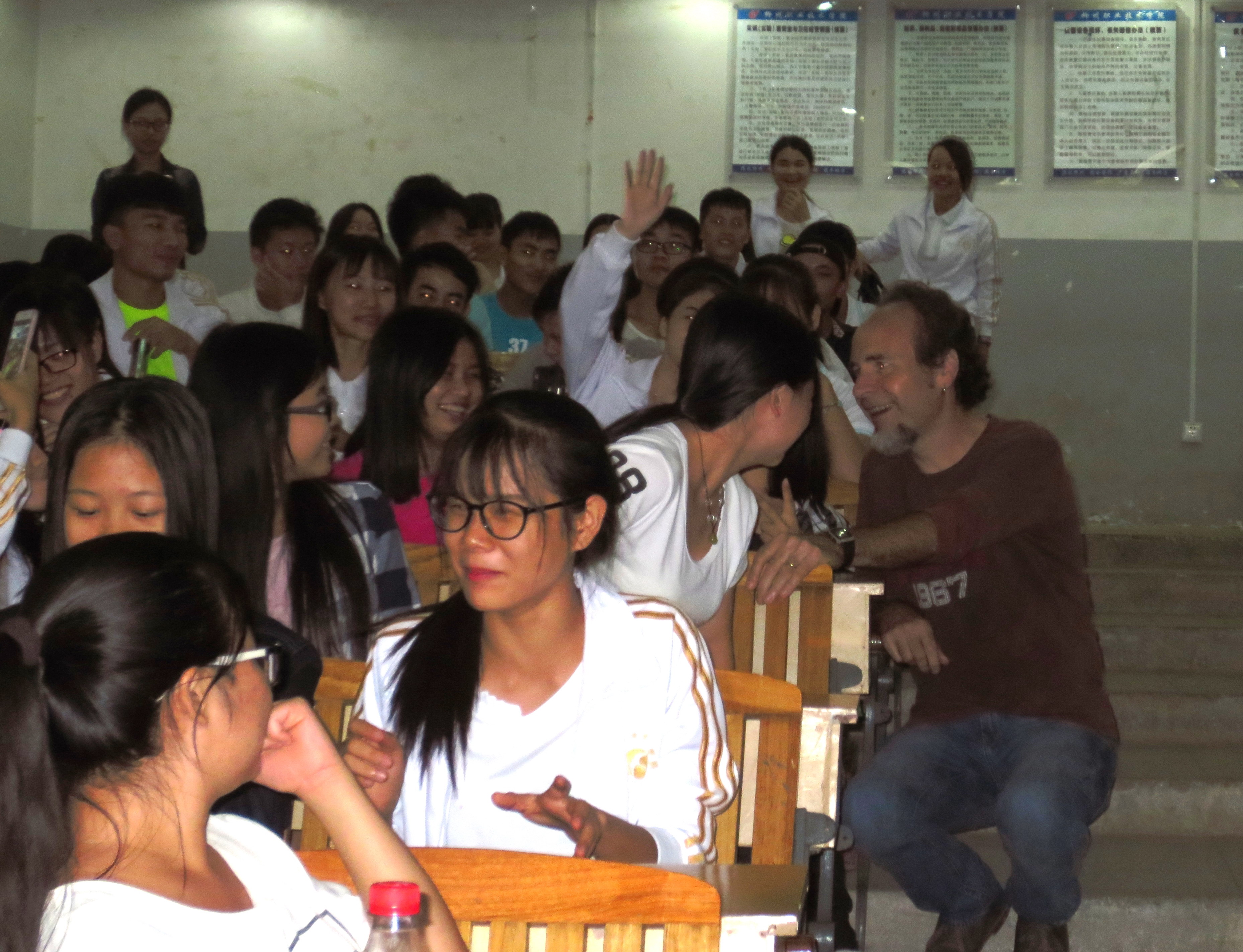 活动现场,师生济济一堂,互动热烈。同学们在认真听着Hamrick先生对自己和美国重要节假日的介绍,也积极地用英语与Hamrick先生交流。有的学生问到了NBA和Obama;有的问他会不会中文、怎么和中国人交流、爱不爱吃螺狮粉;也有同学和他交流音乐,当场唱起了英文歌……