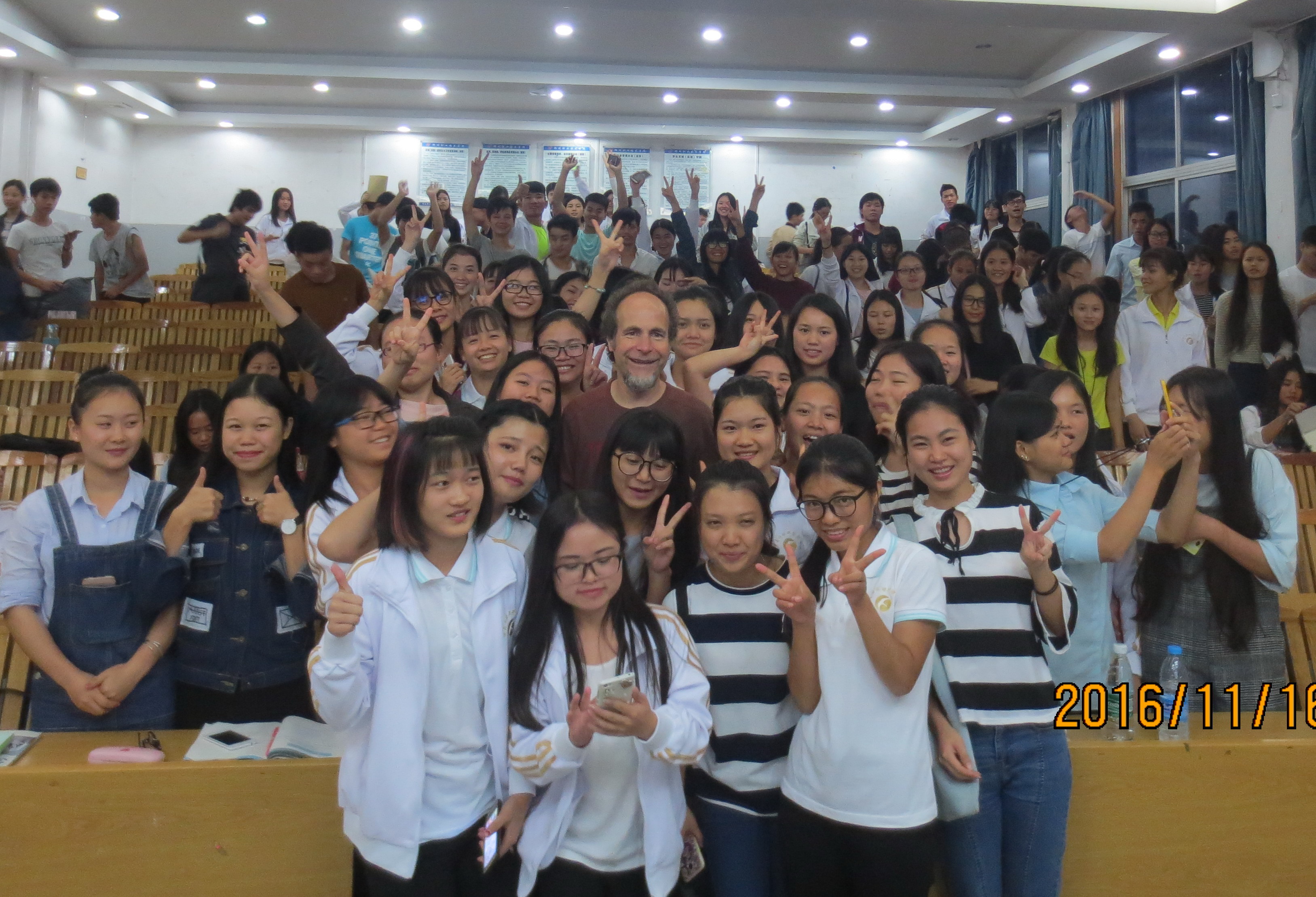 新闻网消息(文/公共基础部 李彩霞 图/公共基础部 桂桔、李彩霞)2016年11月16日晚,来自柳州姐妹城市-美国俄亥俄州辛辛那提市的Joe Hamrick先生受公共基础部高职英语教学团队的邀请,来到我校德馨楼101教室,与贸易与旅游管理学院的学生开展外教课活动,活动由公共基础部高职英语教学团队桂桔和李彩霞组织。
