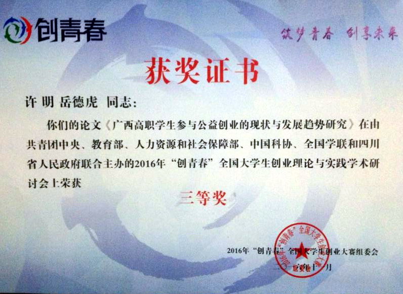 评选活动自今年7月上旬启动以来,组委会共收到论文380篇,涵盖高校257所、省级团委3个。最终评选出优秀论文130篇,其中一等奖19篇、二等奖38篇、三等奖73篇,我校公共基础部、思政部就业与创业训练中心许明、岳德虎老师合作的论文《广西高职学生参与公益创业的现状与发展趋势研究 》荣获三等奖。