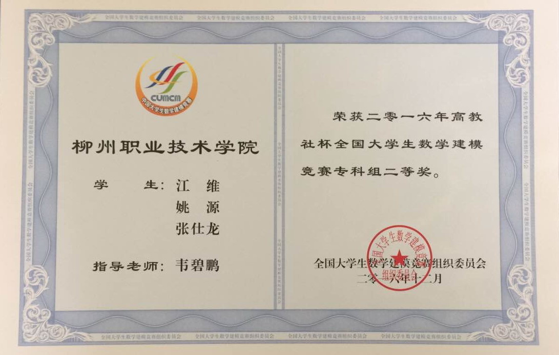 新闻网消息(文、图/公共基础部 韦碧鹏)从广西教育厅获悉,我校师生在2016年全国大学数学建模竞赛中荣获佳绩:五支参赛队中,一支队伍获国家二等奖兼广西赛区一等奖,一支队伍获广西赛区二等奖,一支队伍获广西赛区三等奖,其余两支队获成功参赛奖;公共基础部高职数学教学团队老师韦碧鹏分别荣获广西教育厅和全国大学生数学建模竞赛广西赛区组委会颁发的“2016年优秀指导教师”荣誉称号。