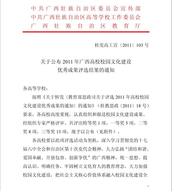 自治区教育厅、自治区高工委于2011年12月22日下发了《关于公布 2011 年广西高校校园文化建设优秀成果评选结果的通知》(桂党高工宣〔2011〕103 号),我院申报的《创建“四大”文化名片 彰显具有高职特色的校园文化》建设成果荣获优秀成果二等奖。全区各高校共有27项校园文化成果被授予“2011年广西高校校园文化建设优秀成果”荣誉称号。