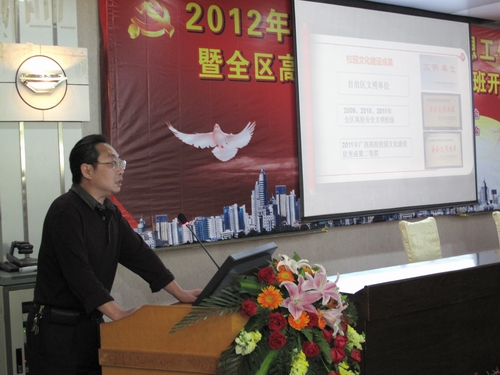 熊文华副院长在发言中首先介绍了我院2011年我院宣传思想工作的总体思路。他说,在2011年,我院按照“站好高度、追求深度、加大力度、服务大局、服务师生”的工作思路,结合学习型党组织建设、创先争优等活动,积极创新工作的内容形式、方法手段,取得了良好的效果。在校园文化建设方面,学院承接上一年度校园文化建设的良好势头,以“六个一”为载体和平台,践行十七届六中全会精神,校园文化建设项目《创建“四大”文化名片 彰显具有高职特色的校园文化》荣获广西高校校园文化建设成果二等奖。随后,熊文华副院长根据会议的安排,向与会人员具体介绍了我院加强校园文化建设的“六个一”特色措施,即“举办一次辅导报告会”、“组织一次理论研讨会”、“开展一系列典型事迹报道”、“打造一个文化讲坛”、“建一个传媒文化基地”、“搭建一个校企文化融合平台”。通过这些典型措施,我院校园文化建设工作发挥了校园文化的育人功能,丰富了大学生思想政治教育载体和途径,受到了上级领导和同行的关注。