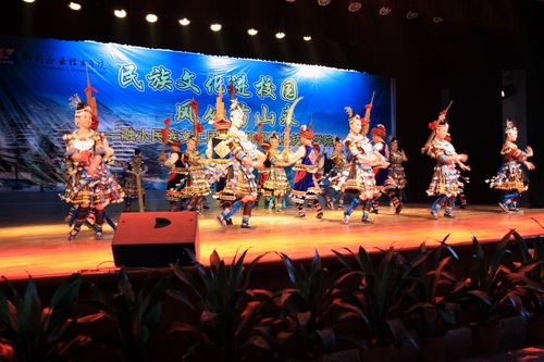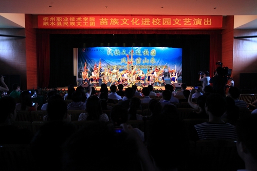 演出在充满激情的歌舞《笙歌融水》中拉开帷幕,随后的《苗族服饰展示》、苗族果哈弹唱、舞蹈《醉了苗寨》等节目,展现了苗族文化艺术与民族风情。约80分钟的精彩节目得到了现场师生的热烈响应,其中苗族传统节目《拉鼓》把现场观众的参与热情推向了高潮。浓郁的民族风情与国家示范性高职院校的校园文化交相辉映。