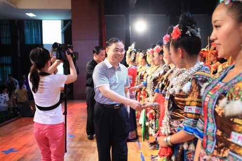 2012年6月20日下午,融水苗族自治县党委常委、宣传部部长、副县长路燕云和副县长何志忠率融水苗族自治县民族文工团走进我院艺术校区大礼堂,带着一台精心准备的民族民俗歌舞节目,为师生们送上了一顿丰富的文化大餐。学院党委书记朱伟才、副书记阳旭出席现场观看演出。学院还特邀了鱼峰区委书记董凌,区委常委、区委办公室主任王轶及区文体局、各街道办事处负责人等到现场共同观看了演出。