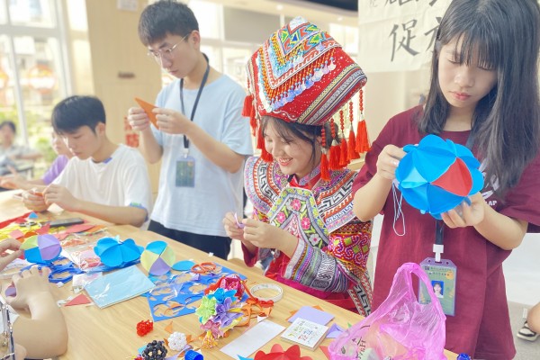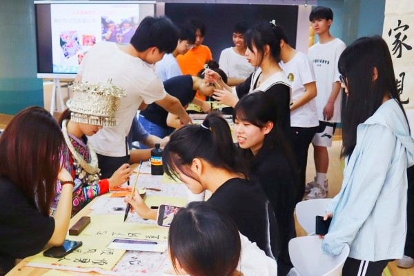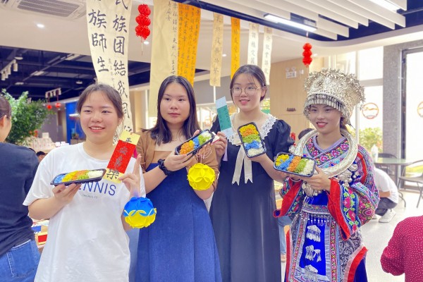 4月22日下午,欢乐的广西民歌在匠心书院匠心大厅响起,“重温经典,‘触摸’传统,感悟民俗文化美”文化体验日活动拉开帷幕,身穿壮族服饰的学子首先为同学们声情并茂地介绍“壮族三月三”的传统习俗。随后,我校宏源书画社、手工艺术协会的同学们组织现场学子以体验手工制绣球、书写古诗词、书法抄写广西民族歌谣的方式感受壮乡特色的民族风情。在书院“初心区”,“壮乡魅力”光影剧场为学子们展播广西民族文化经典电影《刘三姐》,以影视穿越时空的感染力,让现场学子沉浸感受“壮族歌仙”刘三姐文化经久不衰、深入人心和卓然独立的文化魅力?;疃谘ё用堑幕渡τ镏薪咏采?,大家共品五色糯米饭、对唱山歌,收获了自己的手工作品和书法作品,感受广西民族文化扑面而来的魅力,增强了对家乡文化的自信与自豪。