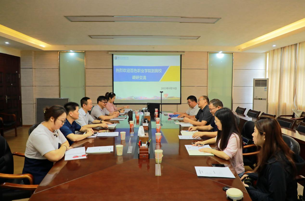 新闻网消息(文/党委宣传部 莫仁仁 图/党委宣传部 李卓)6月16日上午,百色职业学院副院长林灿东带队一行5人,到我校社湾校区开展调研交流。我校党委书记刘子林、总会计师冉福松、党委宣传部相关人员出席交流会并陪同参观。