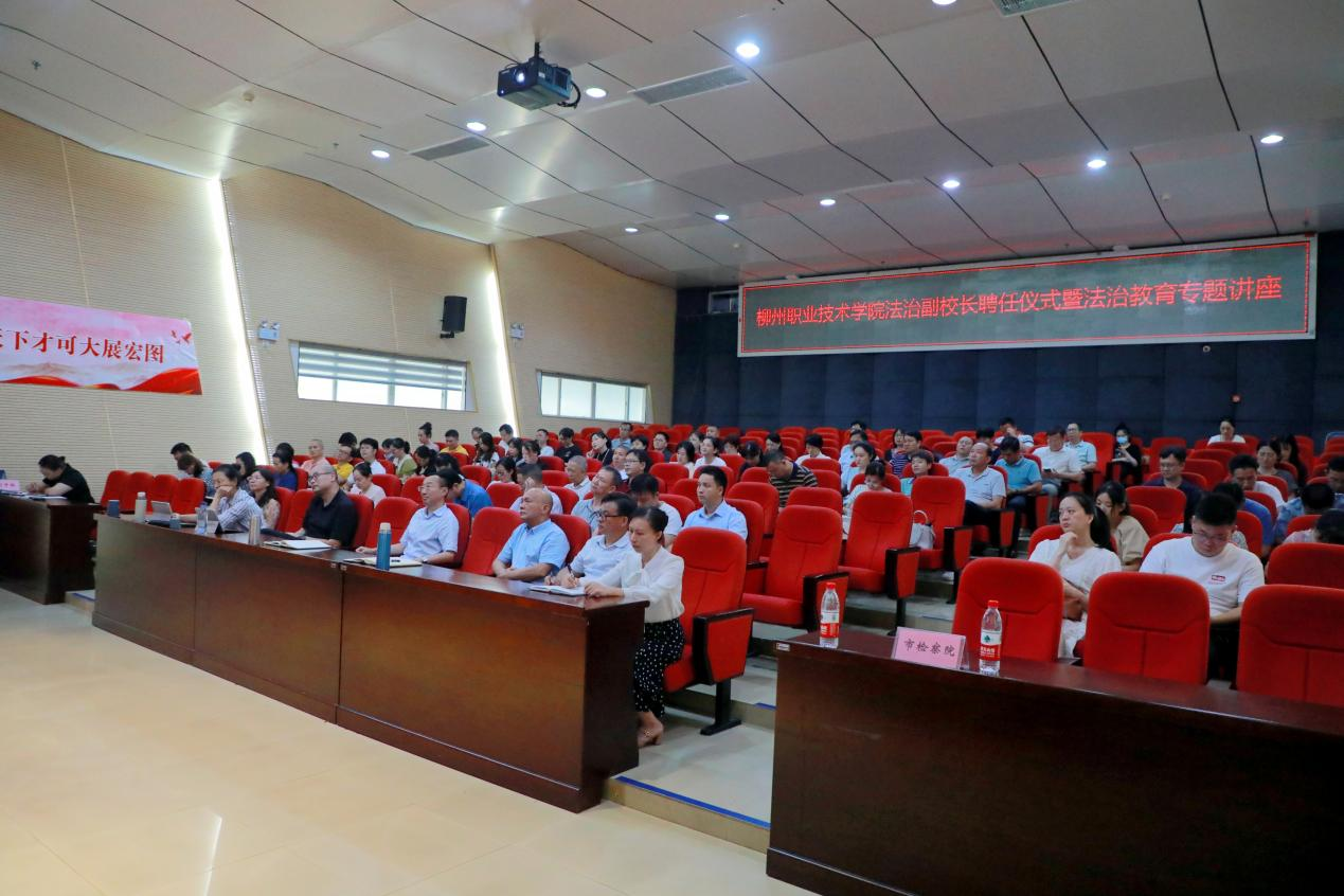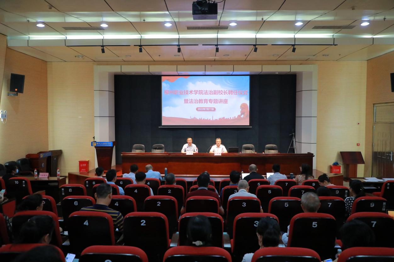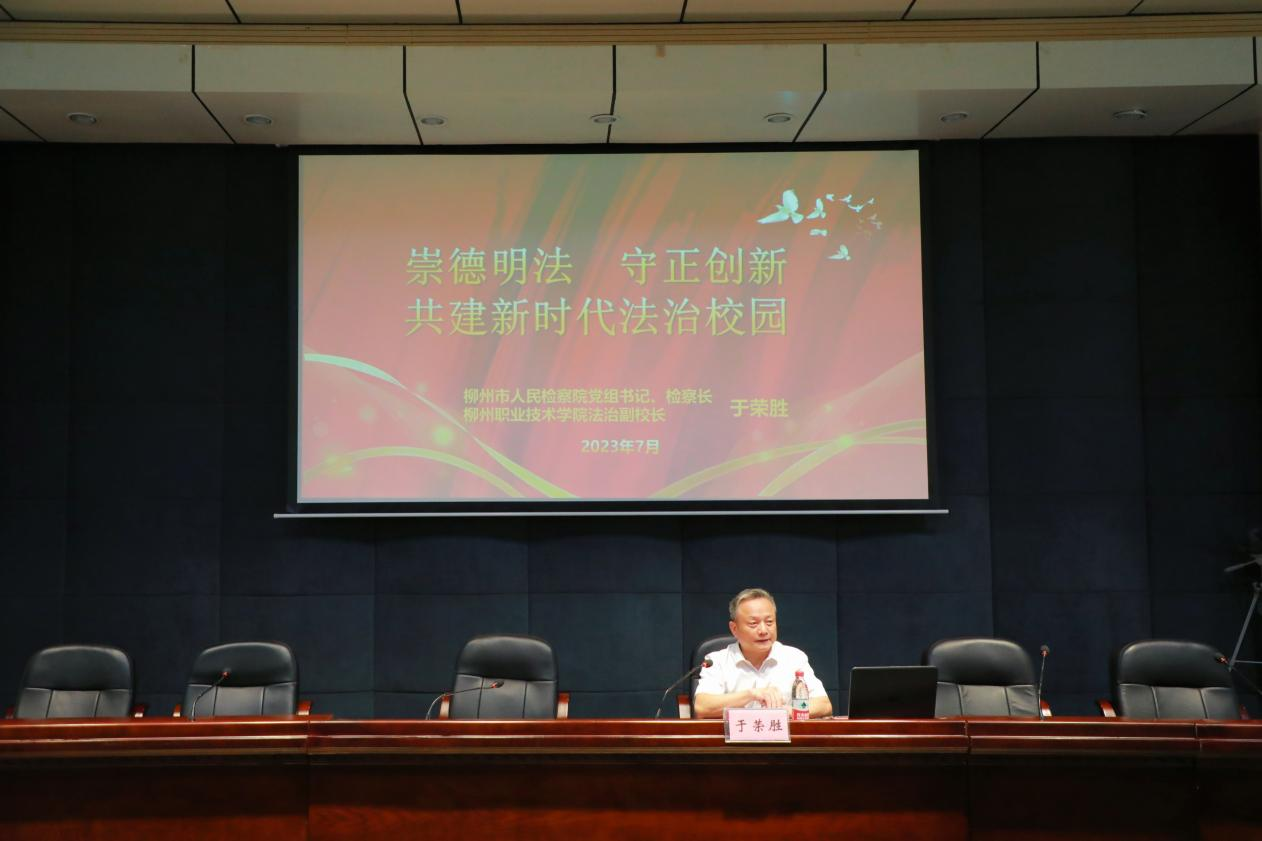 新闻网消息(文/党委宣传部 莫仁仁 图/党委宣传部 陈晨)为加强学校法治建设,创建依法治校示范校,推动高质量发展,2023年7月11日下午,我校在社湾校区100报告厅举行讲座,由柳州市人民检察院党组书记、检察长于荣胜作法治教育专题教育。学校党委书记刘子林主持。