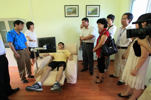 学院心理健康教师向与会领导、老师介绍音乐放松椅的功能及使用方法
