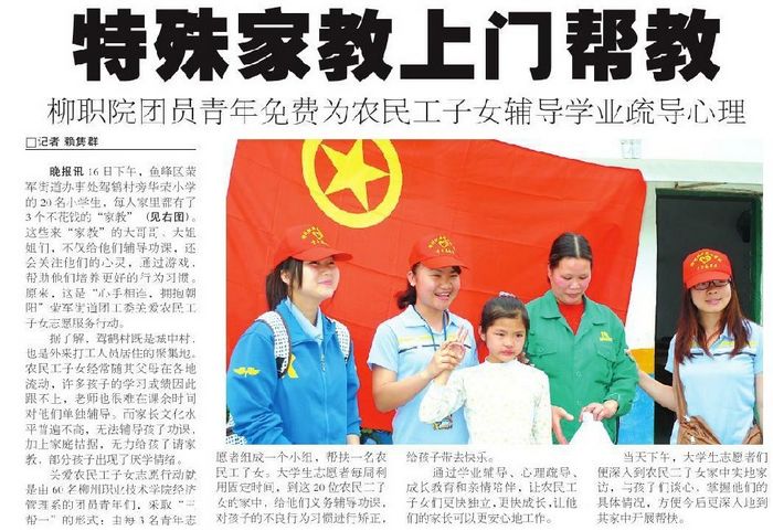 2011年4月19日,《柳州晚报》报道我院团员青年免费为农民工子女辅导学业疏导心理的新闻。
