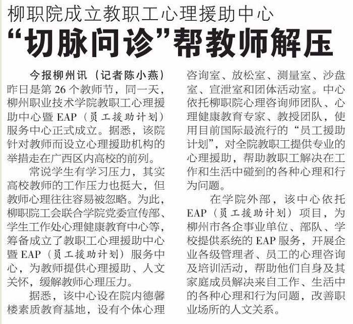 据报道,第26个教师节之际,柳州职业技术学院教职工心理援助中心暨EAP(员工援助计划)服务中心正式成立,学院针对教师而设立心理援助机构的举措走在广西区内高校的前列。
