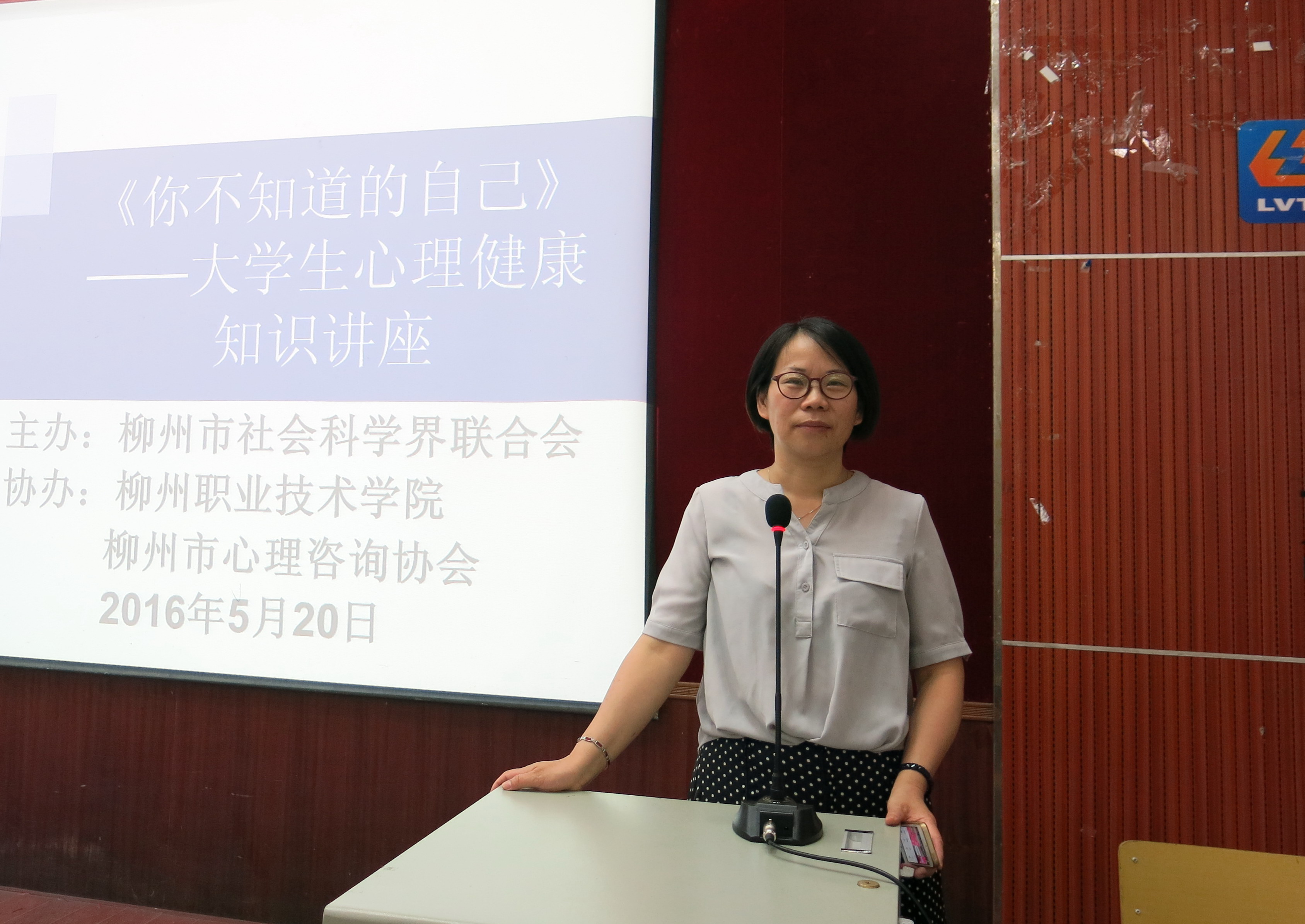 新闻网消息(通讯员/ 公共基础部 韦柳钰 万维口才协会 何苗 摄影/公共基础部 韦柳钰)为更好引导在校大学生关注自身的心理健康,解决学生紧张、焦虑、烦燥、忧郁、记忆下降等心理问题,推进心理辅导工作进校园,把心理压力转换为学习动力,促进学生心理健康,5月20日,在全国大学生心理健康日即将到来之际,受博雅素质大讲堂之邀,柳州市政协委员、柳铁中心医院临床心理咨询门诊主任、柳州市心理咨询协会会长、广西心理卫生协会理事、柳州医学会精神卫生分会副主任委员、柳州红十字会心理救援队队长、精神科副主任医师、心理治疗师、心理咨询师、国家心理咨询培训师谢静在德馨楼101教室给同学们带来一场主题为“你不知道的自己”的心理健康知识讲座。
