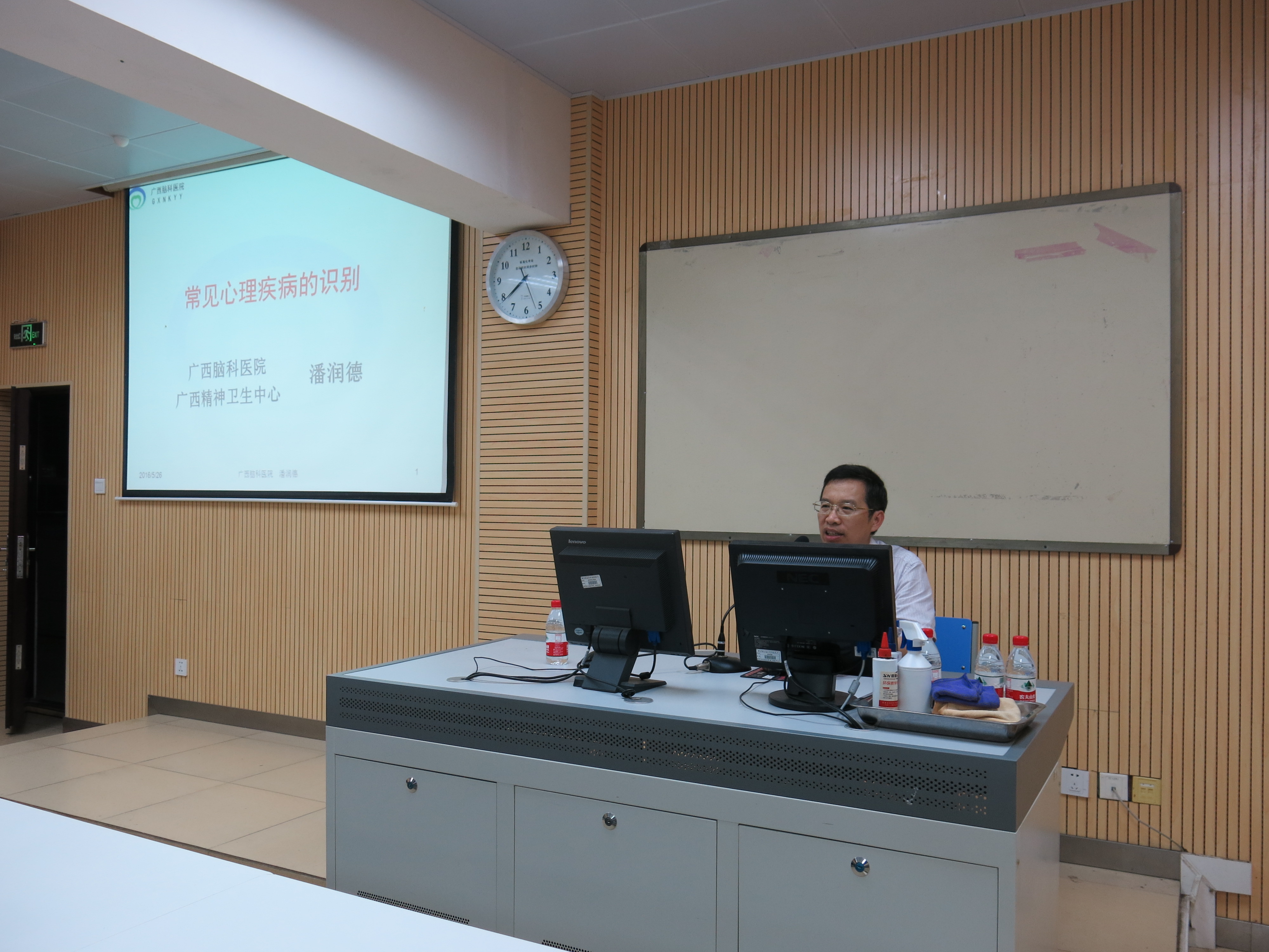 新闻网消息(通讯员/公共基础部 姚鲲鹏)为了提升我院辅导员队伍的职业素质,进一步推动我院心理健康教育工作的发展,5月26日晚七点半,我院邀请广西脑科医院潘润德教授在博闻楼412教室作了一场题为《常见心理疾病的初步识别》的讲座,学院纪委副书记傅昌德研究员和学工处领导、老师与各系辅导员共60多人到场聆听。