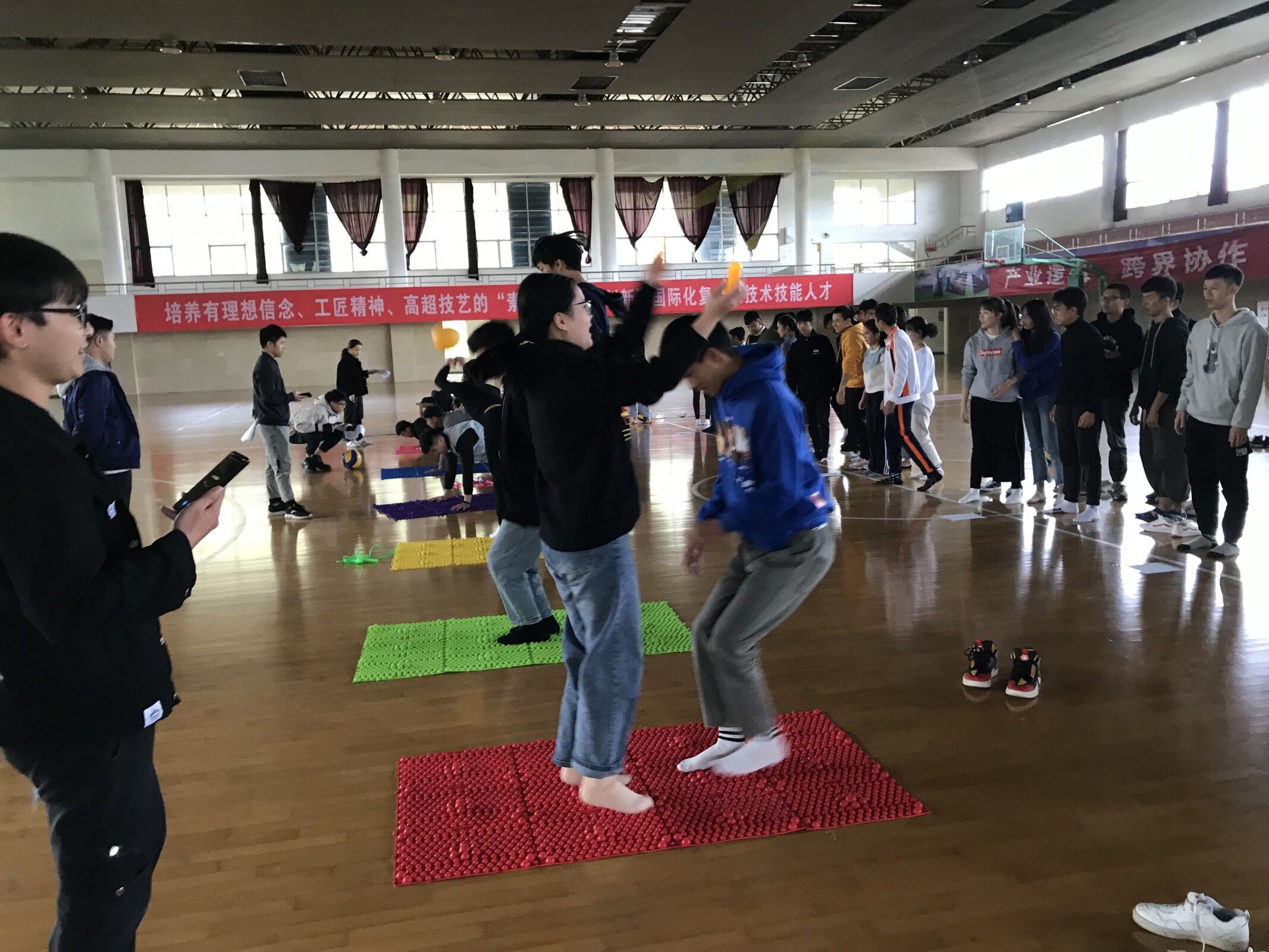 (文、图/学生工作处 郑柳萍)为进一步增强我校综合服务中心队员们的团队协作能力,搭建彼此沟通交流平台, 11月29日下午1点30分,在学校体育馆四楼举办了两校区素质拓展活动。共有80多名值班员和老师参加了活动。