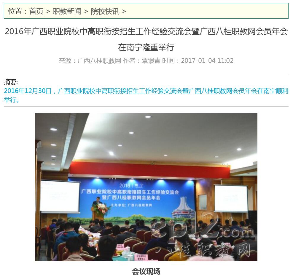 2016年1月4日,广西八桂职教网在职教新闻-院??煅独改恐?,刊发我校老师在2016年广西职业院校中高职衔接招生工作经验交流会上做典型发言的新闻。(截图:石玉丹)