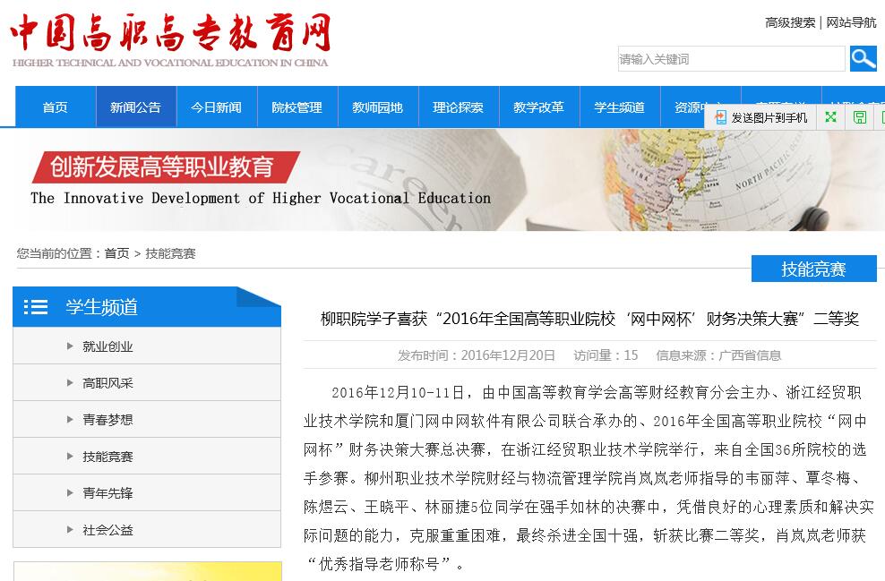 2016年12月20日,中国高职高专网在学生频道刊发了我校学子参加技能竞赛喜获“2016年全国高等职业院?!型莆窬霾叽笕倍冉钡男挛?。(截图:石玉丹)详情请点击:http://www.tech.net.cn/web/articleview.aspx?id=20161220120422006&cata_id=N030