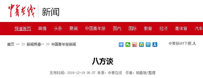 2016年12月19日,中青在线在新闻频道-中国青年报新闻栏目,以“八方谈”为题,刊发我校领导参加在北京国家会议中心举办的国际创新创业博览会及“2016高职院校创新创业示范?!被疃T诟咧按葱麓匆荡ヂ厶持?,作为优秀院校代表,我校党委副书记阳旭发表《“双创”教育助推复合型技术技能人才成长》的主题演讲,介绍我校在创新创业教育的探索与实践经验。(截图:石玉丹)详情请点击:http://article.cyol.com/news/content/2016-12/19/content_14988007.htm