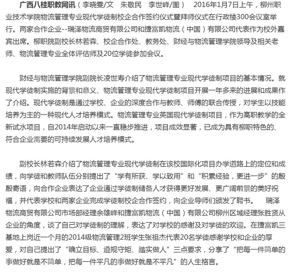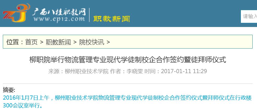 2017年1月11日,广西八桂职教网在职教新闻-院??煅独改?,刊发我校举行物流管理专业现代学徒制校企合作签约暨徒拜师仪式。(截图:石玉丹)详情点击:http://www.ep12.com/a/zhijiaoxinwen/kuaixun/2017/0111/44521.html