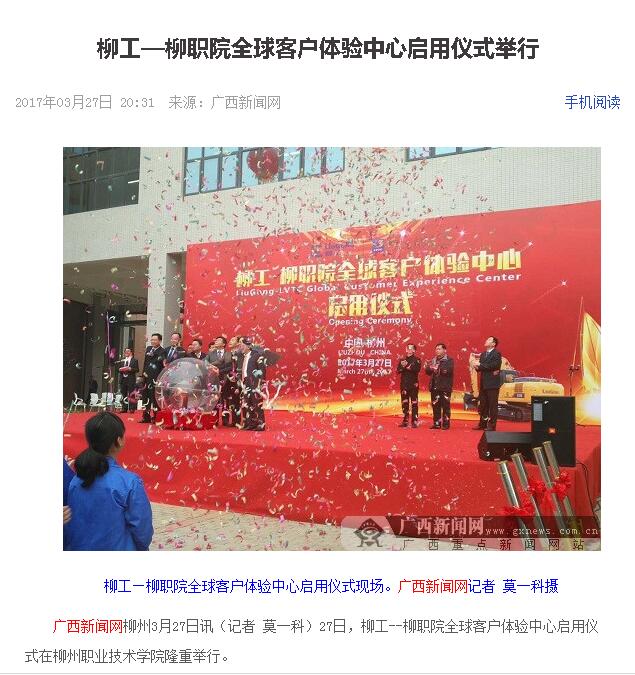 2017年3月27日,广西新闻网以“柳工—柳职院全球客户体验中心启用仪式举行”为题,发布广西柳工机械股份有限公司-柳州职业技术学院全球客户体验中心启用仪式的新闻。详情可点击http://www.gxnews.com.cn/staticpages/20170327/newgx58d9061b-16055945.shtml(截图:唐艳)