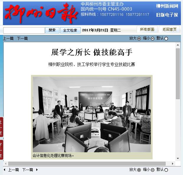 2017年3月21日,柳州日报在第5版,以“展学之所长 做技能高手”为题,刊发“2017年柳州职业院校、技工学校学生专业技能比赛”在柳州职业技术学院举行的新闻。详情可点击http://szb.lznews.gov.cn/lzrb/html/2017-03/21/content_24478.htm(截图:唐艳)