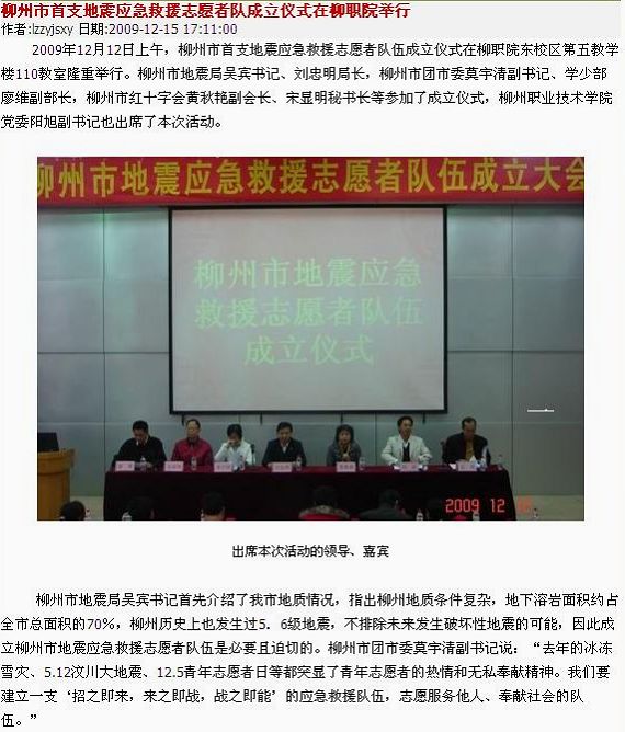 2009年12月15日,柳州教育网发布柳州市首支地震应急救援志愿者队成立仪式在我院举行的信息。(图/蒋玉梅)