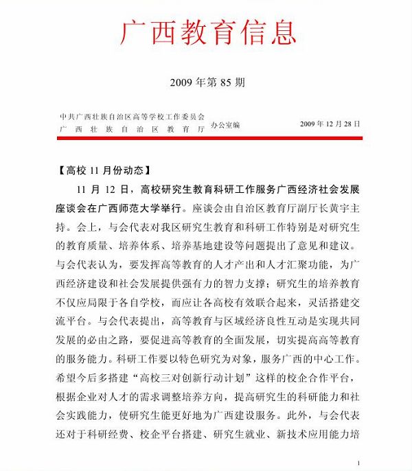 2009年12月28日,《广西教育信息》2009年第85期发布我院举行2010届毕业生双选会的信息。(图/蒋玉梅)