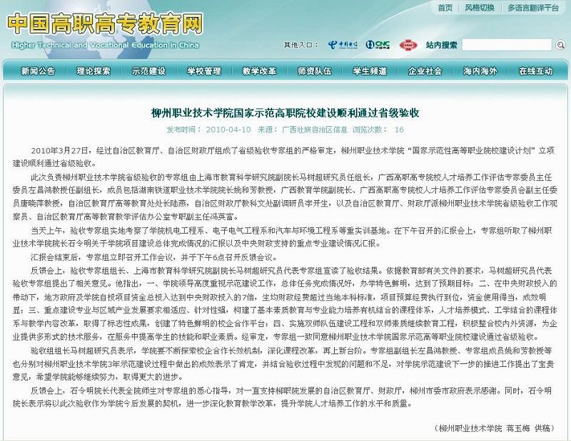 2010年4月10日,中国高职高专教育网发布我院国家示范高职院校建设顺利通过省级验收的信息。(图/蒋玉梅)