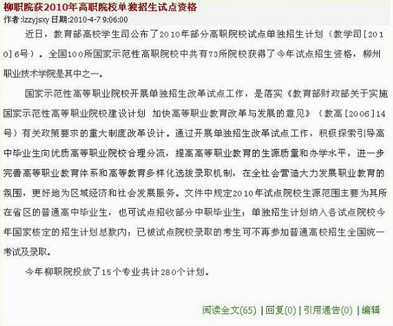 2010年4月7日,柳州教育网发布我院获得2010年单独招生改革试点院校资格的信息。(图/蒋玉梅)