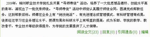 2010年5月10日,柳州教育网发布我院6对“师徒”获柳州市优秀师徒称号的信息。(图/蒋玉梅)