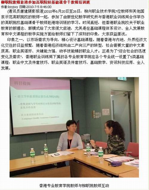 柳州教育网发布我院教师赴港参加高职院?;】喂歉山淌ε嘌蛋嗟男挛? 来源:柳州职业技术学院新闻网 作者:朱汝群 编审: 发布时间:2010-07-08 浏览次数: 次 【字体:小 大】 分享到: 柳州教育网2010年7月5日发布我院教师赴港参加高职院?;】喂歉山淌ε嘌蛋嗟男挛?。(图/朱汝群) 教育网发布我院新闻的截图 关闭 打印正文